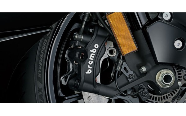 HAYABUSA používá nejnovější brzdové třmeny Brembo Stylema®. Vyznačují se lehčí, kompaktnější a pečlivě navrženou konstrukcí určenou pro použití ve vysoce výkonných motocyklech. U těchto brzdových třmenů je zvýšený průtok vzduchu kolem brzdových destiček pro jejich rychlejší ochlazování a okamžitou reakci. Třmeny jsou spárovány s předními brzdovými kotouči, jejichž průměr byl zvětšen z 310 mm na 320 mm a které jsou opatřeny nově strukturovanými otvory pro další optimalizaci účinnosti chlazení. Tyto prémiové brzdy poskytují vynikající brzdný výkon a modulaci odpovídající extrémnímu výkonu HAYABUSY.